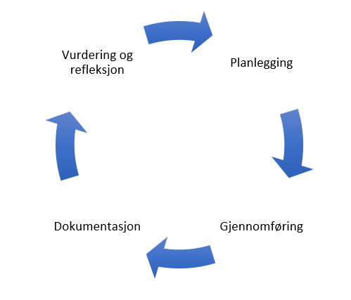 Avdelingens utviklingsmøter planlegges og gjennomføres med agenda og referat og skal ha en rød tråd fra barnehagens årsplan, der kompetanseheving i personalgruppa skal være i fokus. Vår pedagogiske praksis er gjenstand for refleksjon, og på den måten blir det en kontinuerlig utvikling. Gjennom refleksjon over egen praksis kan vi utfordre vår forståelse, holdninger og væremåte i møte med barna og på denne måten utvikle barnehagen som lærende organisasjon. Ved å diskutere vår egen praksis legger vi til rette for enkeltbarnets og barnegruppas trivsel og utvikling. Barnas erfaringer og synspunkter skal ligge til grunn når vi vurderer barnehagens praksis.