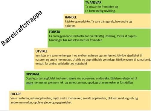 Gode relasjoner er en forutsetning for god læring og utvikling. Et lærende barn må være i et lekende fellesskap. Når vi snakker om læring i barnehagen, så skiller det seg ut fra læring slik en tenker det i skolen. Læring handler om alt fra selvstendighet og mestring, sansing og erfaring, til begynnende danning som menneske i verden. Læring i barnehagen handler om å knytte sammen erfaringer og være på vei til å forstå og kunne mer. Barn lærer gjennom hele dagen, både i formelle og uformelle situasjoner, og da spesielt i lek. Læring starter i det sanselige og erfarte, her utvikles en kroppslig og nonverbal forforståelse også kalt bodymind. Bodymind refererer til en helhet forståelse av mennesket, der kropp og sinn ses på som tett sammenvevde og gjensidig påvirkende. Det vil ligge en naturlig progresjon fra barnet starter som ettåring til det står klar til å forlate barnehagen som seksåring. Progresjonen oppstår likevel ikke helt av seg selv, det krever et personal som har kunnskap om barns læring og utvikling, samt er aktivt til stede og engasjerte i barnas utforskning. Gjennom dette arbeidet vil personalet kunne finne måter å utfordre og utvide barnas teorier og erfaringer, gjennom å tilføre nye materialer, ideer og elementer. Om vi skal forstå danning inn i læringsperspektivet må vi ta med oss at vi lever i en verden i rask endring. Avstander har blitt kortere, teknologien utvikles i et ekstremt tempo og verdens behov er i stadig endring. For å møte framtidens behov trenger fremtidens borgere å være nysgjerrige, kreative og åpne. Bærekraftstrappa viser den sosiale dimensjonen. Fra å bli kjent med seg selv og andre mennesker, til å ta vare på seg selv, hverandre og naturen.